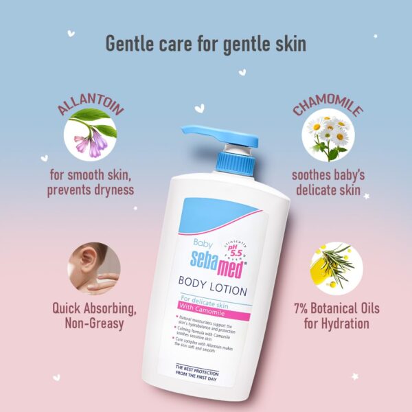Sebamed Baby Lotion 750ml – pH 5.5 Intensive Hydration for Baby’s Delicate Skin. Lock in moisture and protect your baby’s sensitive skin with Sebamed Baby Lotion 750ml. This large, rich lotion with pH 5.5 provides intensive hydration, reinforcing the skin’s natural protective barrier. Easily absorbed, it soothes and moisturizes, keeping baby’s skin soft, smooth, and healthy from head to toe.