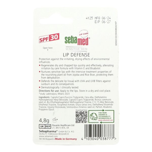 Sebamed Lip Defense Balm SPF 30 – Healing & Protecting Lip Balm for Dry, Chapped Lips. Nourish and protect your lips with Sebamed Lip Defense Balm SPF 30. This advanced formula instantly soothes and regenerates dry, chapped lips, while providing essential SPF 30 protection against sun damage. With Vitamin E and Jojoba Oil, it keeps lips soft, smooth, and healthy, preventing further damage.