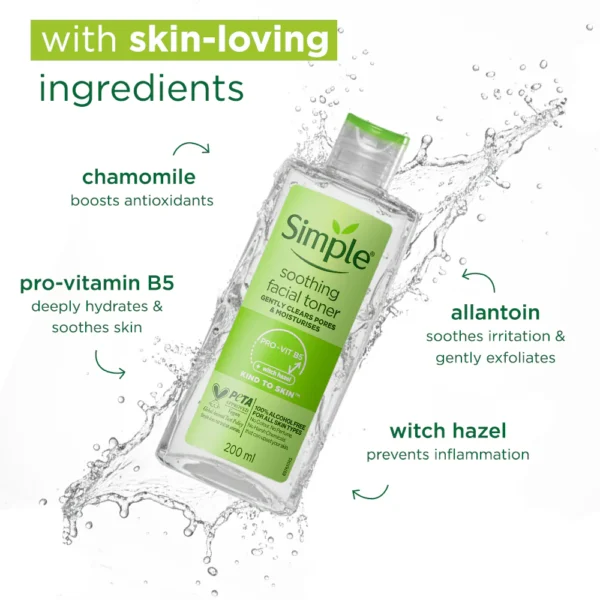 Simple Soothing Toner 200ml – Kind to Skin | Exporter in Asia and Africa is a gentle and refreshing facial toner designed to keep the skin calm, hydrated, and balanced. Suitable for all skin types, it is especially ideal for sensitive skin, helping to soothe irritation and reduce redness. The toner works to refresh the skin after cleansing while maintaining its natural moisture balance, leaving the face feeling soft and comfortable.
